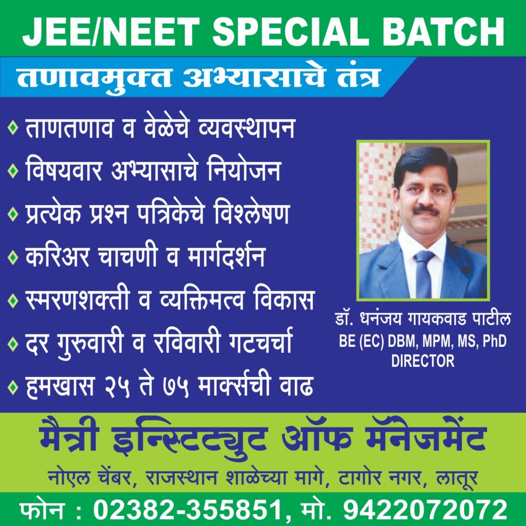 Maitree Institute of Management, Latur offers a JEE / NEET Special Batch Program designed to help students prepare effectively with stress-free study techniques, structured learning methods, and expert guidance.